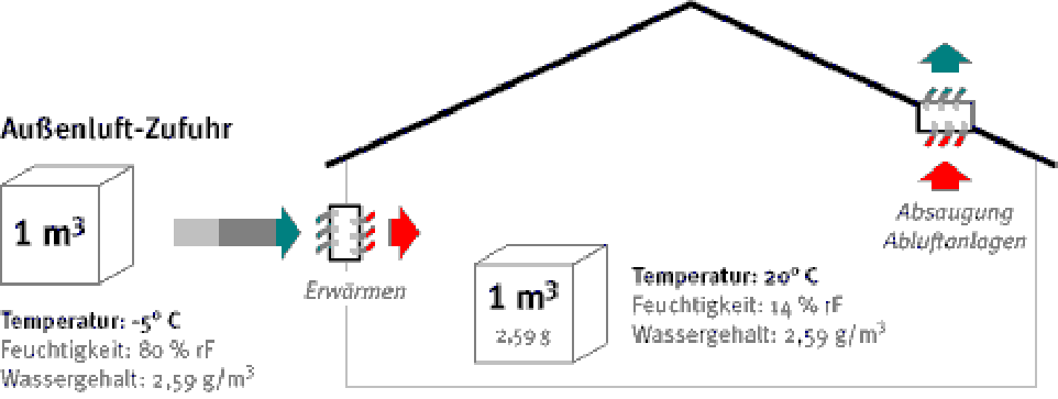 Wird 1 m³ Luft mit einer durchschnittlichen Temperatur von –5° C und einer relativen Luftfeuchte von 80 % über eine KWL einem Gebäude zugeführt und dabei auf 20° C erwärmt, hat dies zur Folge, dass die relative Luftfeuchte bei gleichen Wassergehalt pro m³ auf 14 % sinkt. |