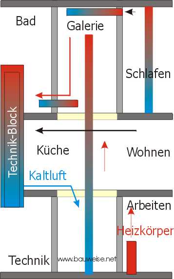 | Der Technikblock, der im Technikraum nach oben offen ist, durchzieht das Haus wie ein Kamin. Im Bad wird somit warme Luft direkt aus dem Technikraum zuströmen können | Die Kaltluft im DG-Schlafen bleibt im Raum... Kaltluft am Boden des Wohnbereiches "fällt" in die Kältefalle des Treppenhauses. | ||