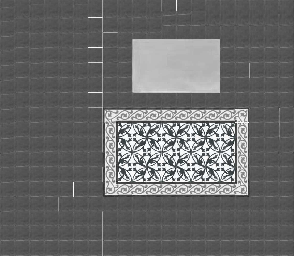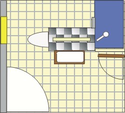 Um eine Vorstellung zu bekommen, wie ein derartiger Boden in unserem Bad wirken wird, haben wir einmal einen möglichen Verlegeplan erstellt. Die helle Fläche ist der Technikblock (eingefliest). |