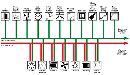 Die Bus-Technik trennt klar die Übertragung von Energie und Information. Bei Neubau oder Komplettsanierung wird daher zusätzlich zur normalen Stromleitung eine Steuerleitung gelegt. Wichtig ist, dass diese Leitung an allen möglichen "Einsatzorten" vorbei führt: Sie verbindet Sensoren (Befehlsgeber wie zum Beispiel Bewegungsmelder, Lichtmesser, Windmesser, Brandmelder, Schalter oder Thermostat) mit Aktoren (Befehlsempfänger, beispielsweise Licht, Heizung, Alarmleuchte oder Jalousie).