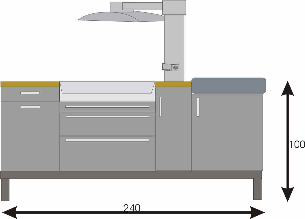 die Dunstabzugshaube muss auf der Arbeitsplatte befestigt sein, die Abluft muss durch den Boden in den unter der Küche liegenden Technikraum geleitet werden können